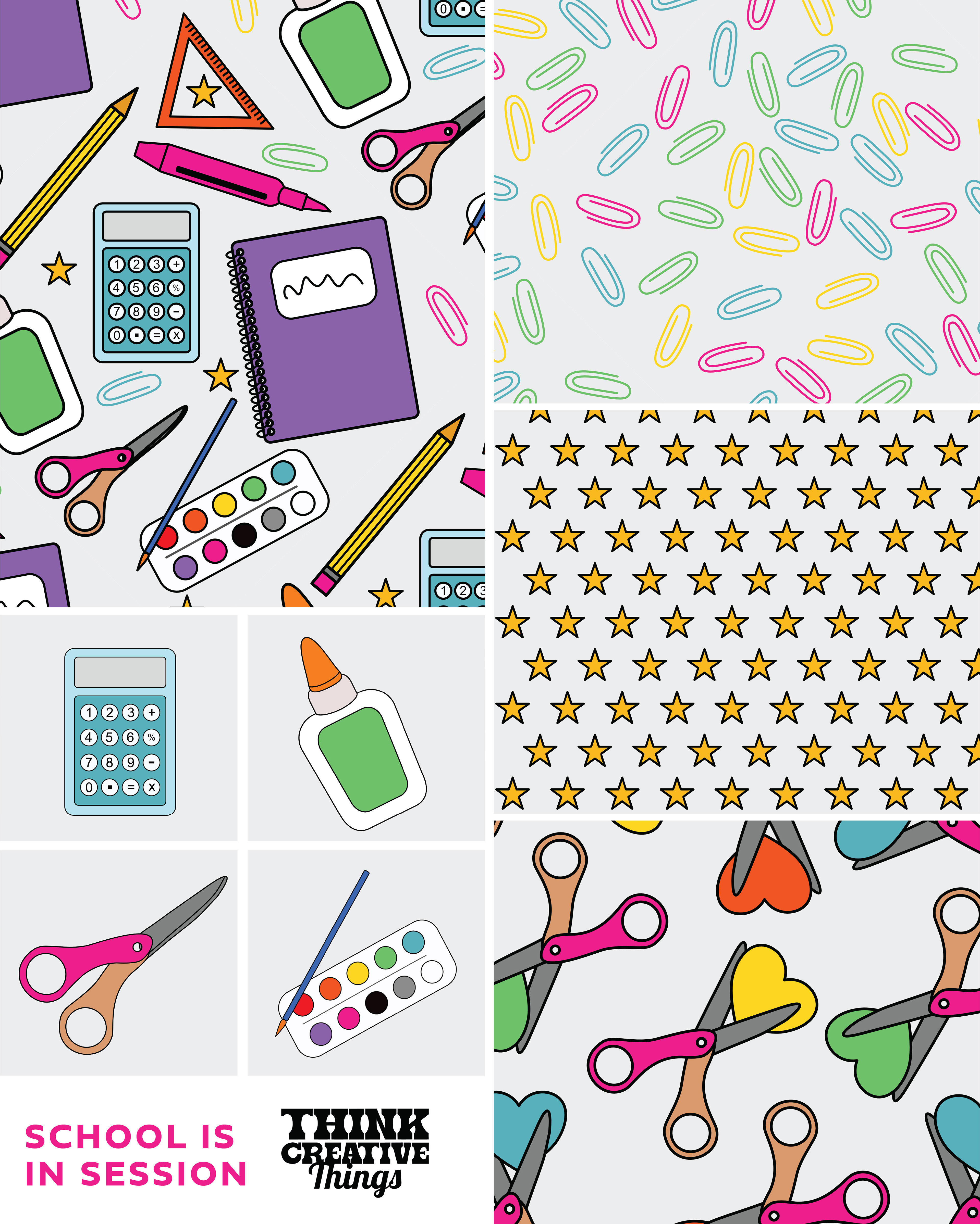You can almost smell the markers and fresh notebooks when you gaze upon this digitally illustrated, fully vectorized pattern collection. Utilizing flat, geometric shapes and bold, friendly colors, each pattern in the collection coordinates with the rest while being unique. The entire collection is available for licensing.
